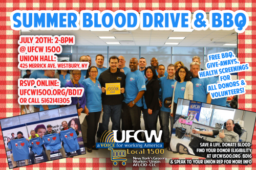 UFCW Local 1500 is having their Annual Summer Blood Drive & BBQ on Thursday, July 20 from 2:00 – 8:00 PM, at their headquarters at 425 Merrick Avenue, Westbury, NY.
